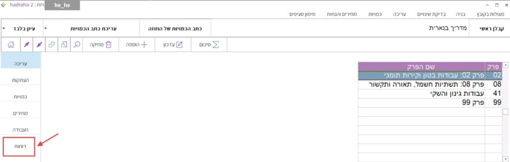 1. מתוך כתב הכמויות או ממסך החשבונות ללחוץ על הכפתור “דוחות” בסרגל הפעולות בצד שמאל: