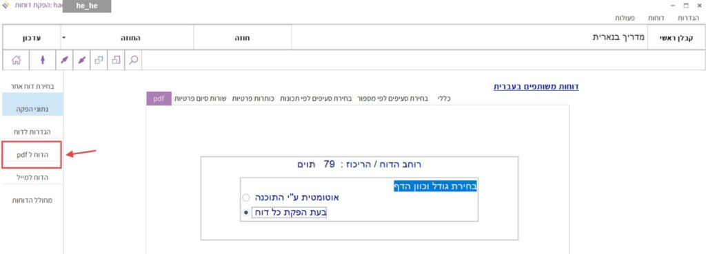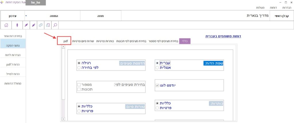 2. נפתח המסך “הפקת דוחות”. לעבור ללשונית “pdf”: