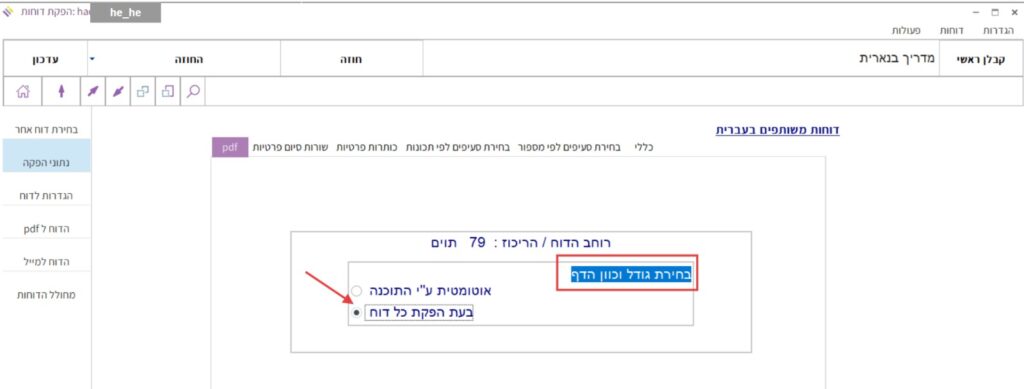 3. תחת הכותרת “בחירת גודל וכיוון הדף” לסמן את האפשרות “בעת הפקת כל דוח”: