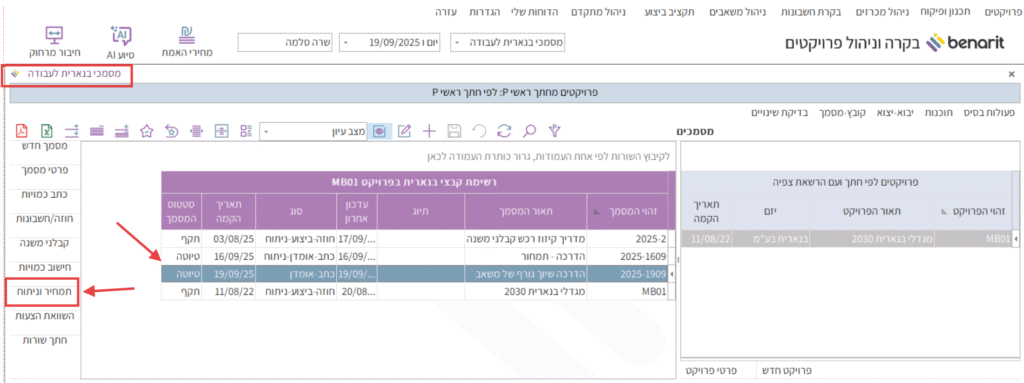 1. במסך “מסמכי בנארית לעבודה” מסמנים את המסמך שרוצים לנתח ובסרגל השמאלי לוחצים על “תמחיר וניתוח”: