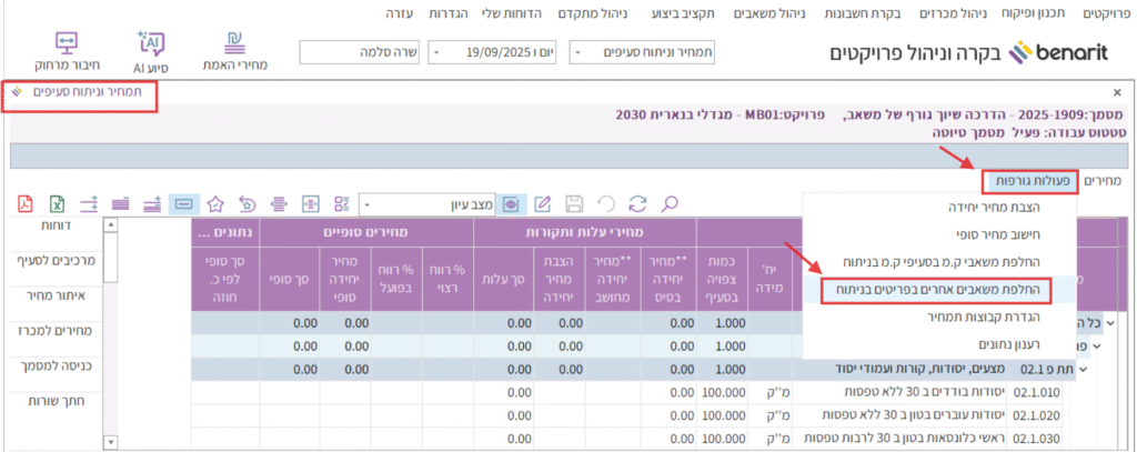 2. מתקבל מסך “תמחיר וניתוח סעיפים”. בשורת התפריטים מתחת לפרטי המסמך בצד ימין, בוחרים בתפריט “פעולות גורפות > ואחר כך ב”החלפת משאבים אחרים בפריטים בניתוח”: