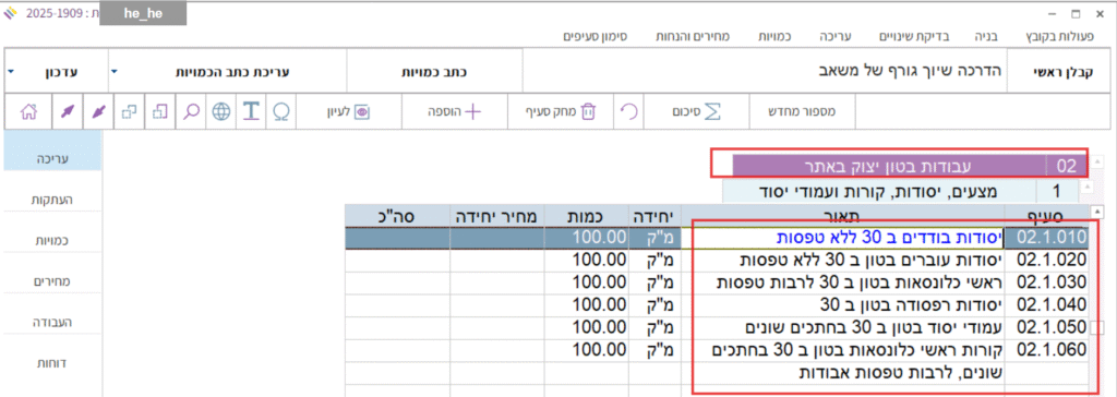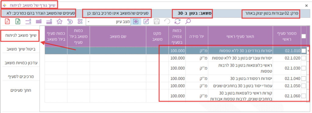 נדגים באמצעות כתב כמויות, פרק 02 תת פרק 1 המכיל שישה סעיפים שאחד מהמרכיבים שלהם בניתוח יהיה בטון ב-30: