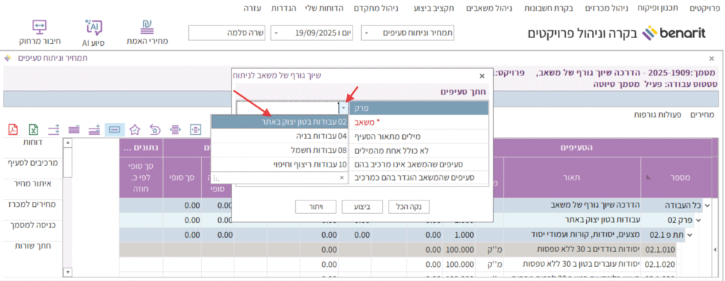 3. נפתחת חלונית “חתך סעיפים”. בשדה “פרק” לבחור את הפרק שבו נמצאים הסעיפים שאליהם רוצים להכניס את המשאב כמרכיב בניתוח: