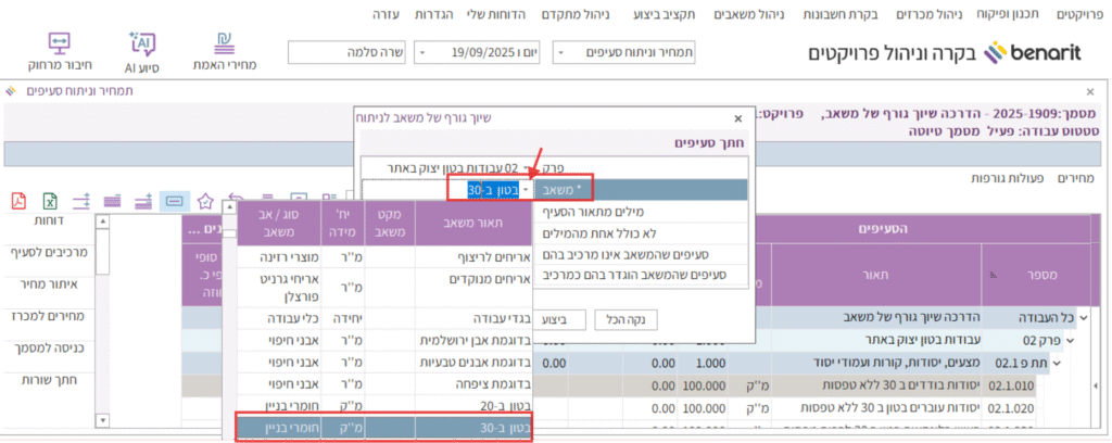 14. כעת מוצגים כל הסעיפים שהמשאב בטון ב-30 מופיע בהם כמרכיב עם כמות המשאב בסעיף שהגדרנו.