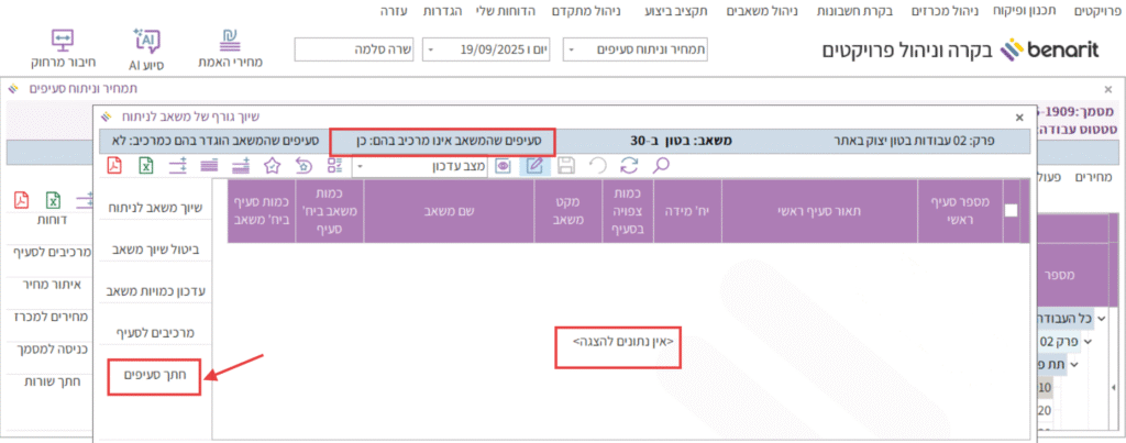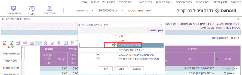 נפתחת חלונית “שיוך גורף של משאב לניתוח” המציגה את קבוצת הסעיפים שעונה על הפרמטרים שהוגדרו בחתך הסעיפים.