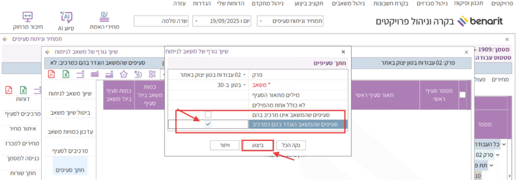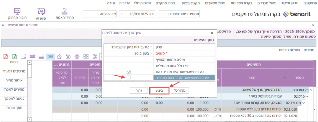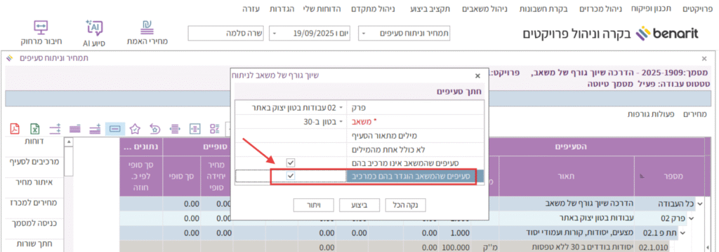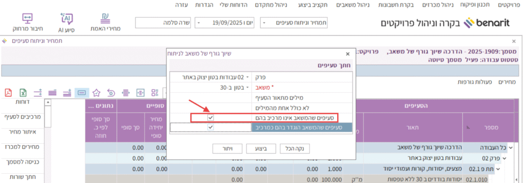 7. במקרה זה, כדי לקבל רק את רשימת הסעיפים שהמשאב בטון ב-30 לא הוגדר בהם עדיין – הסרתי את הסימון מהשורה “סעיפים שהמשאב הוגדר בהם כמרכיב”.