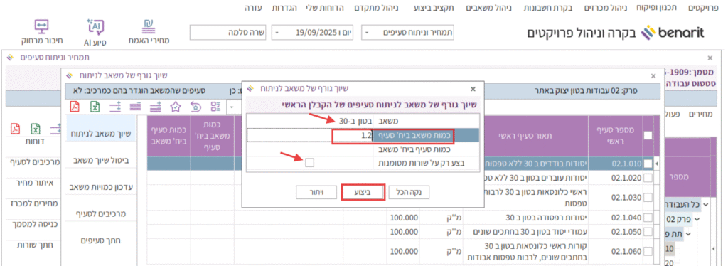 הערה: אם רוצים לשייך רק חלק מהסעיפים ברשימה, צריך ללחוץ על תיבת הסימון שלצידם, ובחלונית השיוך לסמן את השורה “בצע רק על שורות מסומנות”.
