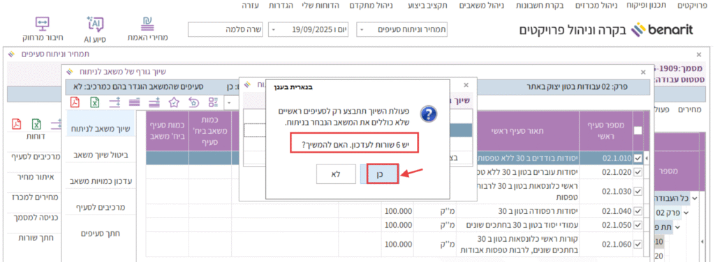 10. מתקבלת הודעה בה מתבקשת הסכמתכם לביצוע העדכון על כמות הסעיפים המוצגת. ללחוץ על “כן”: