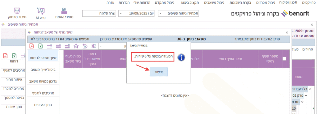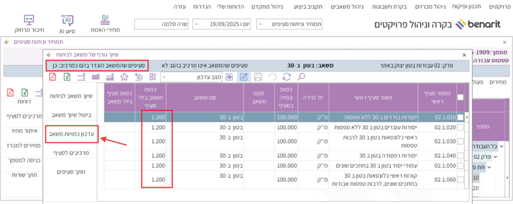 אם רוצים לעדכן את כמות המשאב בסעיפים מסוימים, אפשר ללחוץ על הכפתור “עדכון כמויות משאב” ולהזין את הכמות הרצויה בכל סעיף.