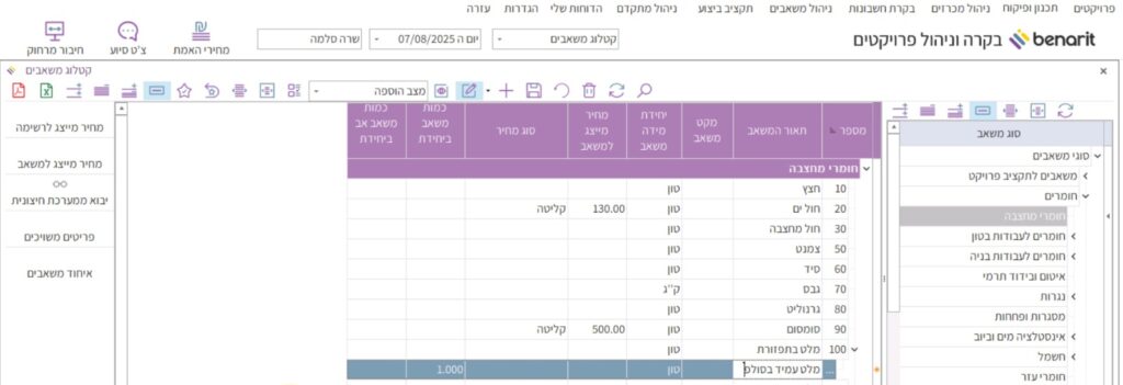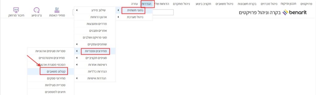 1. במסך הראשי של בנארית להיכנס לתפריט “הגדרות”> “נתוני תשתית” > “מחירונים וספריות” > “קטלוג משאבים”:
