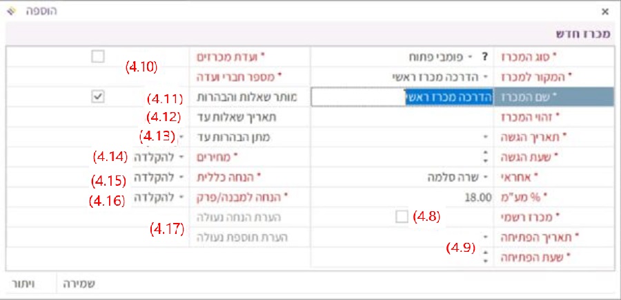 (4.8) השדה “מכרז רשמי”: סימון שדה זה ימנע אפשרות לדחיית מועד אחרון להגשת הצעות רק לקבלן מסוים. עדיין ניתן יהיה לשנות את המועד האחרון להגשת הצעות לכל הקבלנים המשתתפים במכרז, והודעה על השינוי תישלח לכולם.