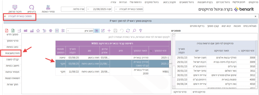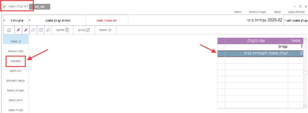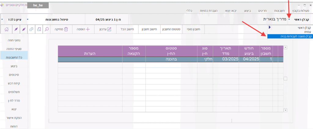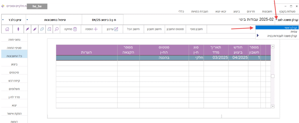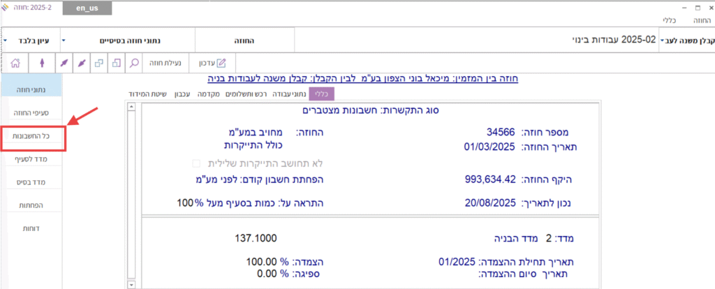 כדי לבדוק את החשבון של הקבלן הראשי, נעבור לחשבונות שלו מתפריט המעבר בצד ימין למעלה. נלחץ על “קבלן ראשי”: