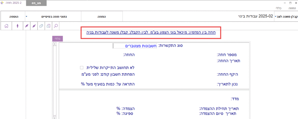 2. המסך להגדרת נתוני החוזה של קבלן המשנה זהה למסך נתוני החוזה של הקבלן הראשי. שימו לב לכותרת שמציגה שהחוזה הוא בין המזמין (הקבלן הראשי) ובין קבלן המשנה: