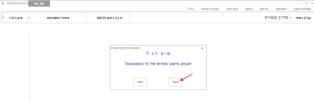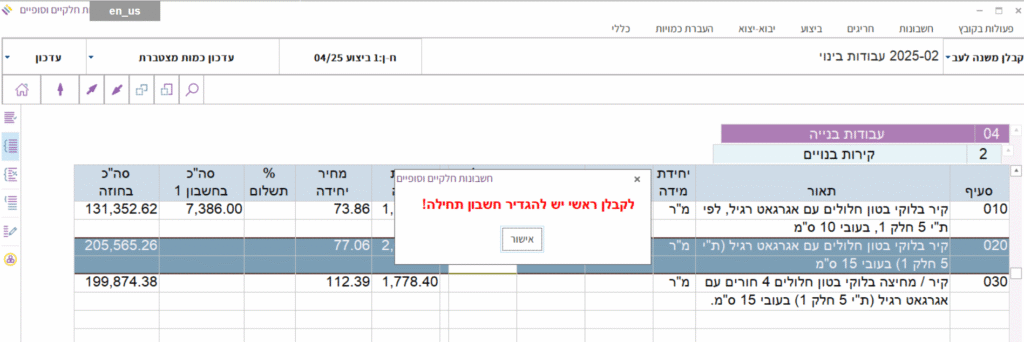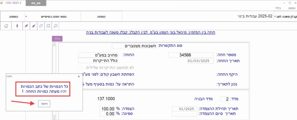 16. מתקבלת הודעה על ביצוע חישוב מחדש של כל החשבונות (פעולה זו מתבצעת אחרי כל שינוי בנתוני החוזה או הביצוע). נלחץ על “אישור”: