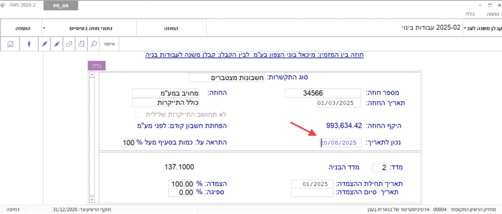 3. נתוני החוזה של קבלן המשנה יכולים כמובן להיות שונים מנתוני החוזה של הקבלן הראשי, החל ממספר החוזה והתאריך ועד להתייקרות וחודש המדד. מעדכנים את הנתונים לפי ההסכם של הקבלן הראשי מול קבלן המשנה.