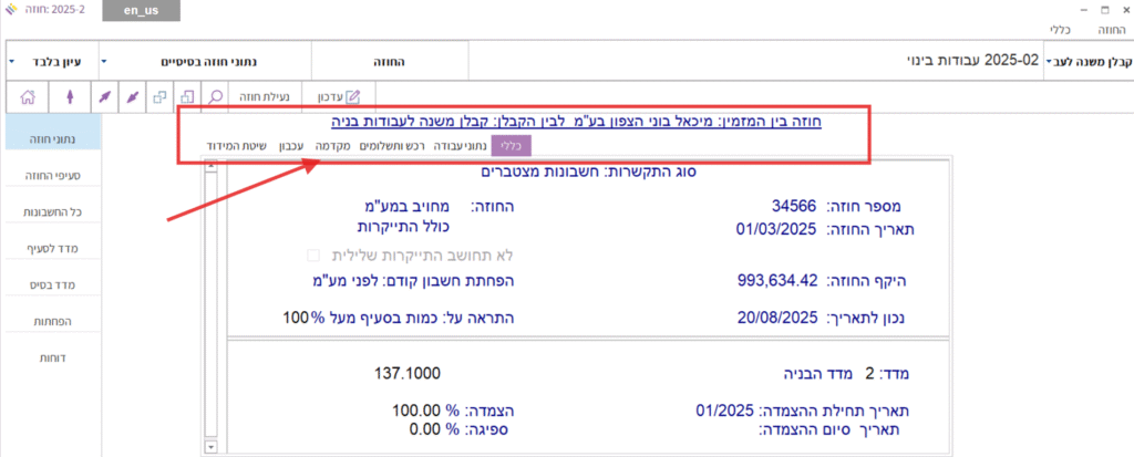 משהוגדרו הנתונים הכלליים ניתן לעדכן נתוני חוזה נוספים כמו למשל מקדמה ועכבון: