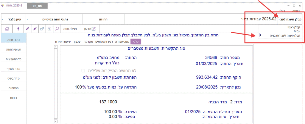 שימו לב: ניתן לעבור בקלות בין החוזים של הקבלן הראשי לחוזים של קבלני המשנה בתפריט המעבר מצד ימין למעלה. מופיע בו בהדגשה שם הקבלן המוצג. לחיצה על המשולש הקטן לצד השם פותחת את התפריט. ניתן לבחור ולעבור אל נתוני החוזה של קבלן אחר בפרויקט: