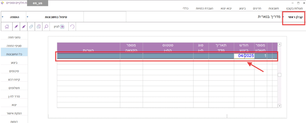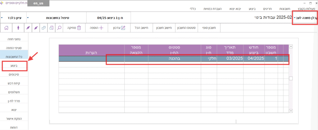 מעדכנים חודש ביצוע ותאריך מדד, מתקדמים ב ENTER וכאשר שורת הפרטים של החשבון הושלמה, לוחצים בסרגל השמאלי על “ביצוע”: