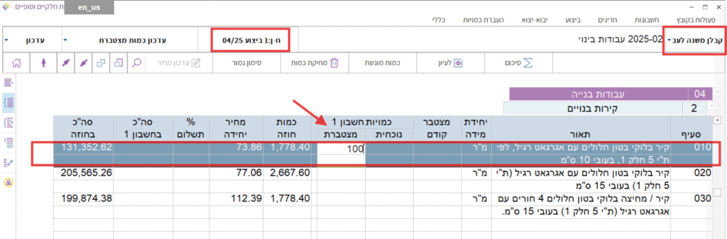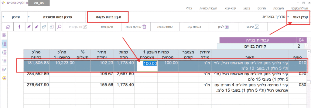 10. נגדיר כעת את שורת הפרטים של החשבון של הקבלן הראשי. שימו לב: כדי לבצע העברת כמויות מהחשבון של קבלן המשנה אל החשבון של הקבלן הראשי, חודש הביצוע חייב להיות זהה: