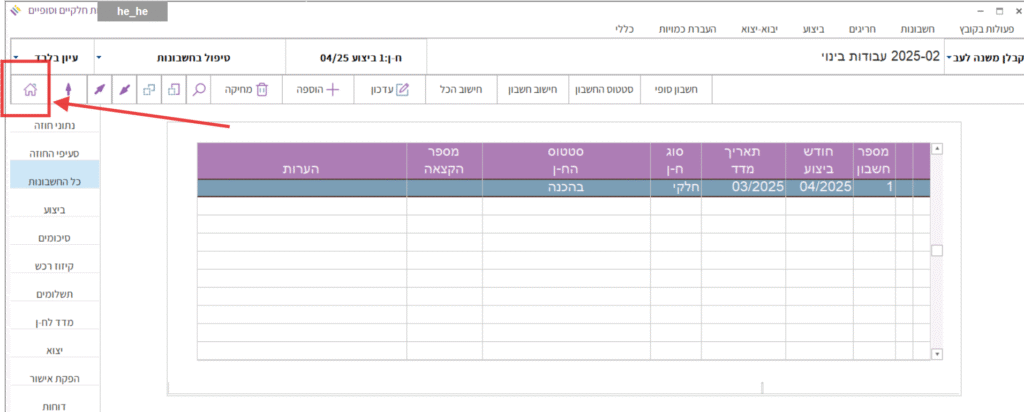 8. מתפריט החשבונות של קבלן המשנה, נלחץ על סמל “הבית” שיעביר אותנו למסך הראשי:
