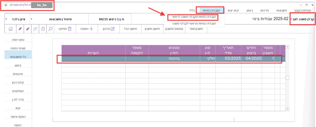 12. התוכנה מעבירה אותנו אל מסך החשבונות של קבלן המשנה שבחרנו. ממסך זה נסמן את החשבון שהגדרנו בו כמויות ביצוע שאותם נרצה להעביר, מהתפריט העליון נבחר ב”העברת כמויות”> ובפעולה “העברת כמויות מקבלני משנה לראשי”: