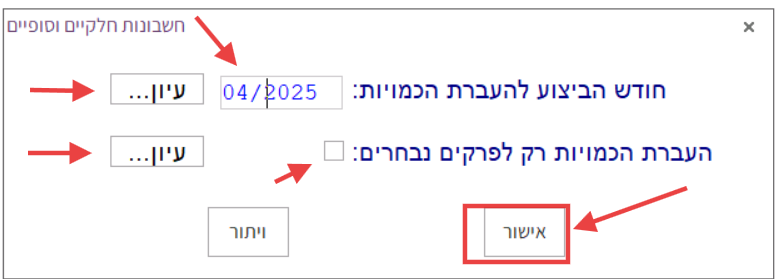 13. בחלונית ההעברה יש לעדכן את חודש החשבון שרוצים להעביר. כדי לבחור מתוך חודשי החשבונות הקיימים, ניתן ללחוץ על כפתור “עיון” באותה שורה.