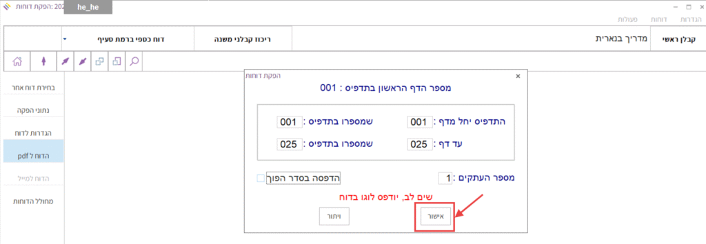 נלחץ על “אישור” בחלונית מספור הדפים בתדפיס: