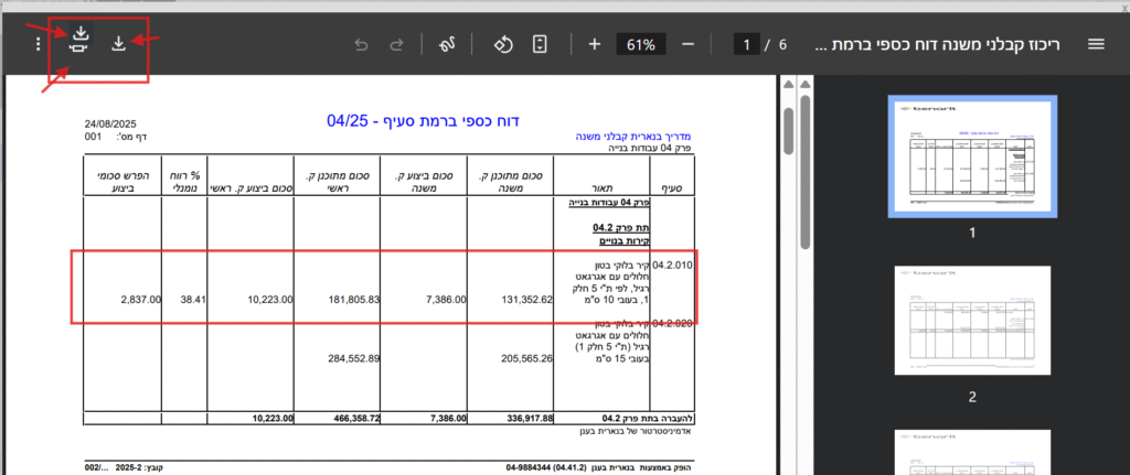 את הדוח ניתן לשמור בתיקיית הורדות/תיקייה נבחרת או להדפיס, בלחיצה על אחד מהסמלים הנמצאים בצד שמאל למעלה: