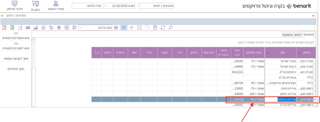 ברשימת המזמינים שבנתוני התשתית, נקבעו תנאי התשלום של “עיריית כרמיאל” כ”שוטף + 60″: