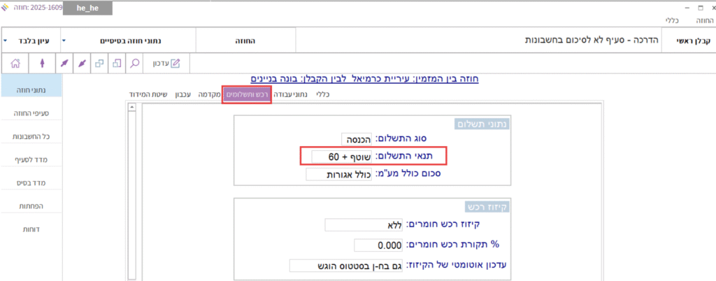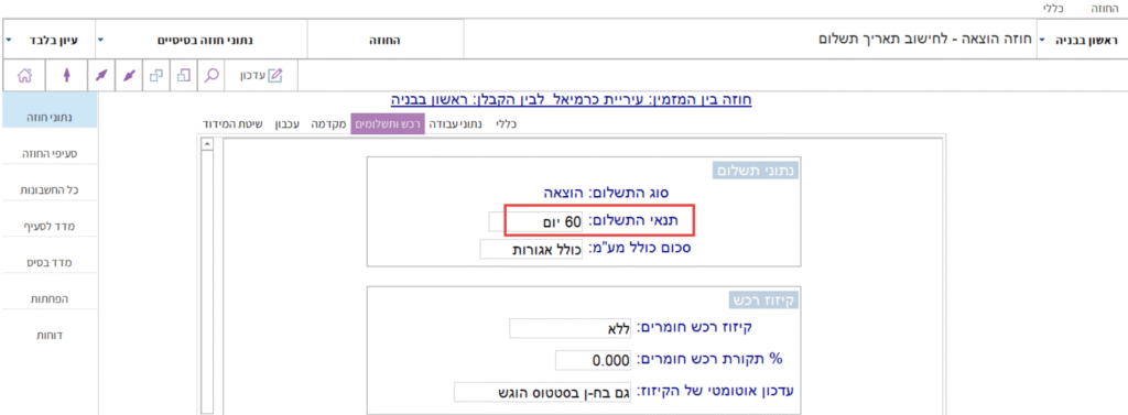 בעת הגדרת חוזה הוצאה מול קבלן המשנה “ראשון בבניה”, נראה בלשונית “רכש ותשלומים” בשדה “תנאי התשלום” את הנתון “60 יום” שהם תנאי התשלום של הקבלן אשר לו צריך לשלם את הכסף: