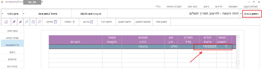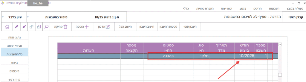 למשל, הוגדר חשבון מס’ 1 לחודש ביצוע 10/2025: