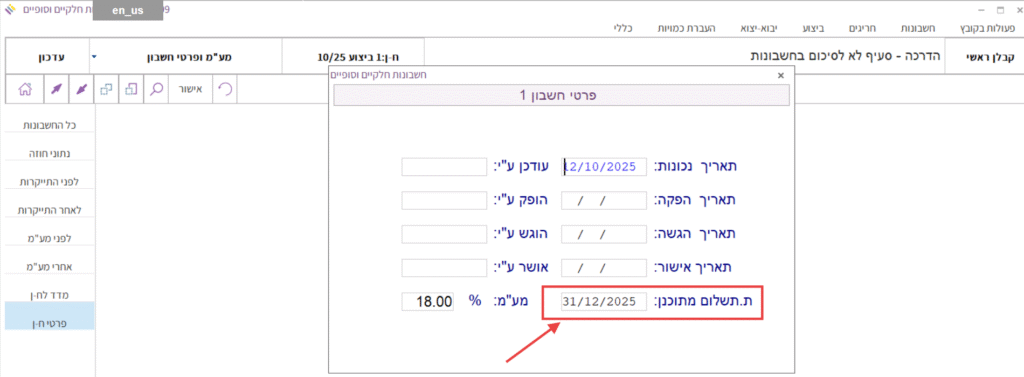 במסך “מע”מ ופרטי חשבון” בשדה “תאריך תשלום מתוכנן” נראה כך: