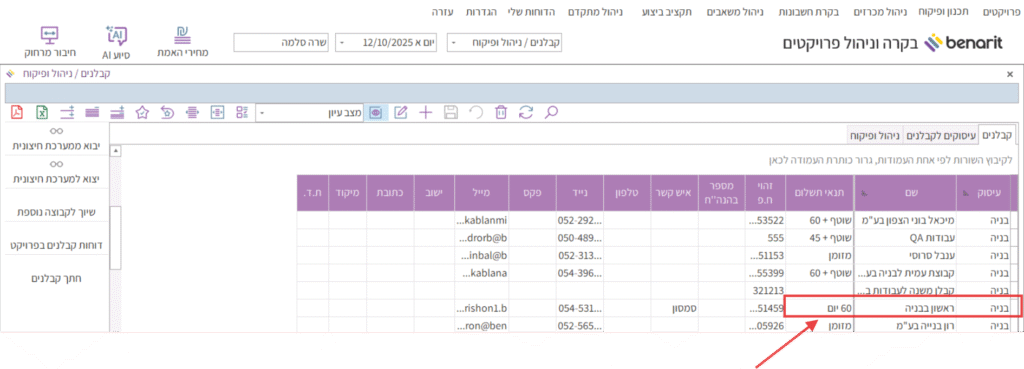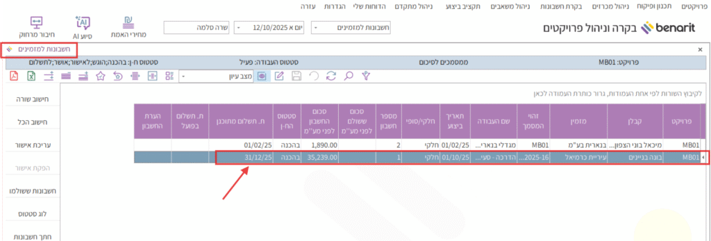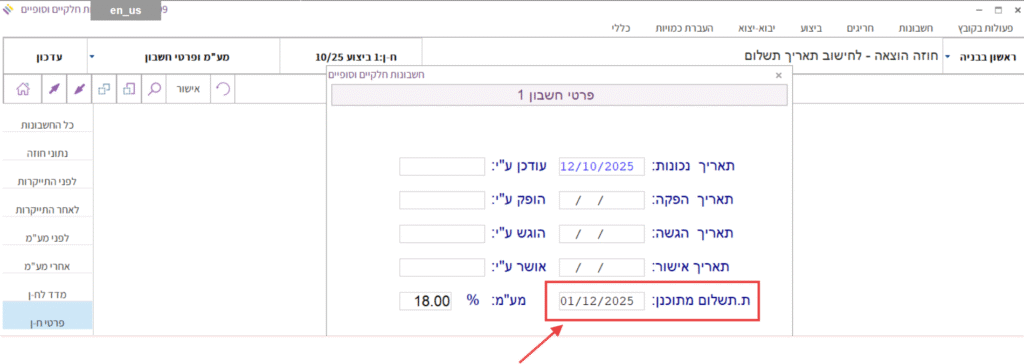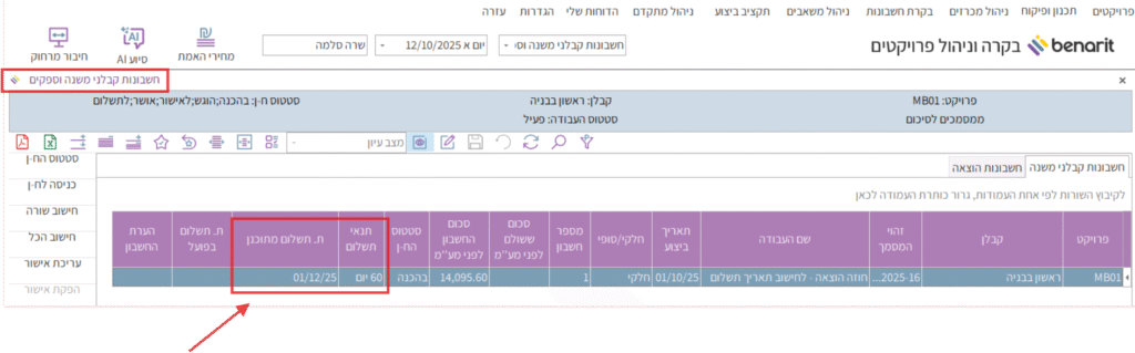 כלומר, כיוון שמדובר בחוזה הוצאה תאריך התשלום המתוכנן, 01/12/2025, מחושב על פי תנאי התשלום של הקבלן שהם 60 יום- (תחילת 10/25 ועוד 60 יום).