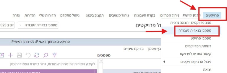 1. במסך הראשי, להיכנס לתפריט “פרויקטים” ולבחור בפקודה “מסמכי בנארית לעבודה”: