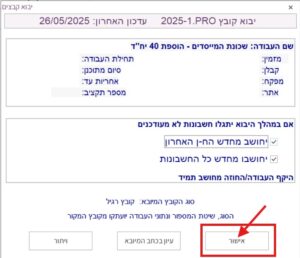 7. נפתחת חלונית שמציגה את נתוני העבודה בקובץ המיובא ומאפשרת לבחור אם לחשב מחדש חשבונות לא מעודכנים