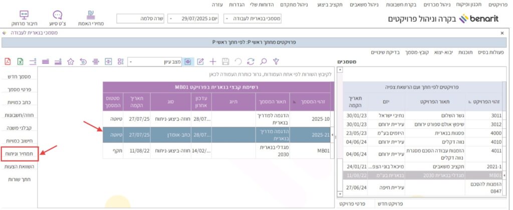 1. במסך “מסמכי בנארית לעבודה”, לסמן את הקובץ שאותו רוצים לייצא, וללחוץ בסרגל בצד שמאל על הכפתור “תמחיר וניתוח”: