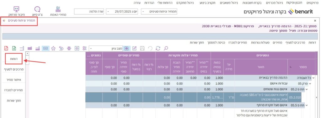 3. נפתח מסך התמחיר. ללחוץ בסרגל בצד שמאל על הכפתור “דוחות”: