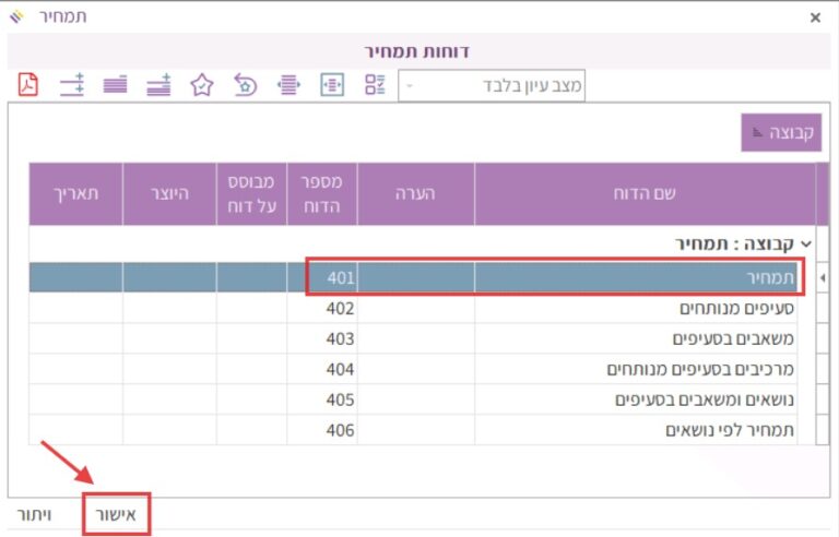 4. ברשימת הדוחות לבחור בדוח הראשון שנקרא “תמחיר” וללחוץ על “אישור”: