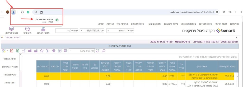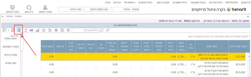 5. בדוח שנפתח ללחוץ בסרגל שמעל טבלת התמחיר, בצד שמאל למעלה על הכפתור המסמל “יצוא לאקסל”: