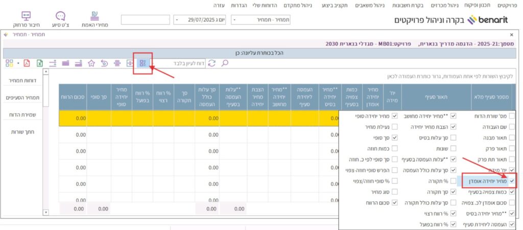7. טיפ: אפשר לבחור אילו עמודות ייוצאו לקובץ האקסל. למשל, אם רוצים לכלול בקובץ שמייצאים את עמודת מחירי האומדן, יש ללחוץ בסרגל הכלים על הכפתור המסמל “בחירת עמודות” ולסמן ב v את העמודה “מחיר יחידה אומדן”: