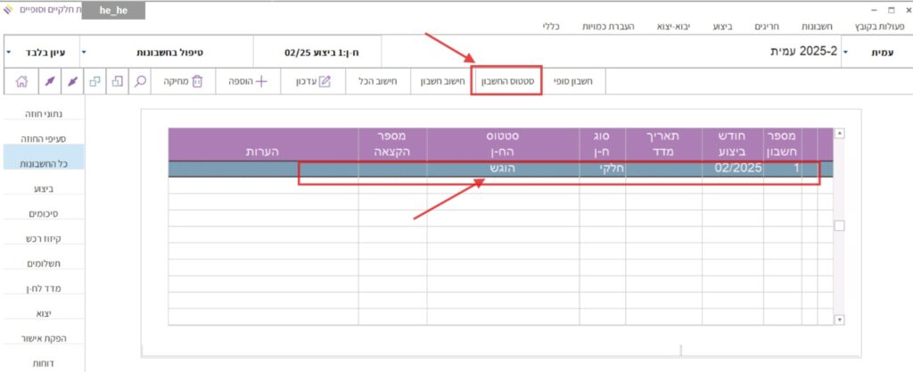 א. במסך החשבונות לוודא שהחשבון הרלוונטי מסומן, ואז ללחוץ בסרגל שמעל טבלת החשבונות על הכפתור “סטטוס החשבון”:
