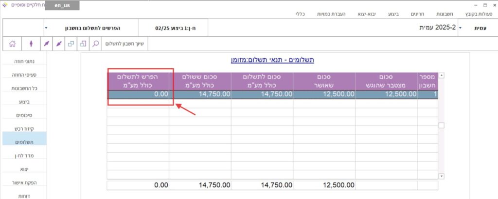 9. במסך התשלומים נראה כעת שבעמודה “הפרש לתשלום” מוצג 0.00, כיוון שהחשבון שולם במלואו: