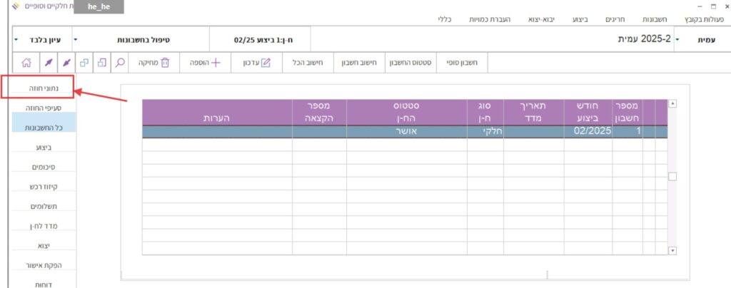 שימו לב: כדי שניתן יהיה להעביר את החשבון לסטטוס “אושר”, התוכנה מחייבת שנתוני העבודה יהיו מוזנים. אם קופצת הודעה על כך שיש להשלים נתוני עבודה הכרחיים, יש להיכנס אל מסך נתוני העבודה באמצעות לחיצה על הכפתור “נתוני חוזה” בסרגל השמאלי: