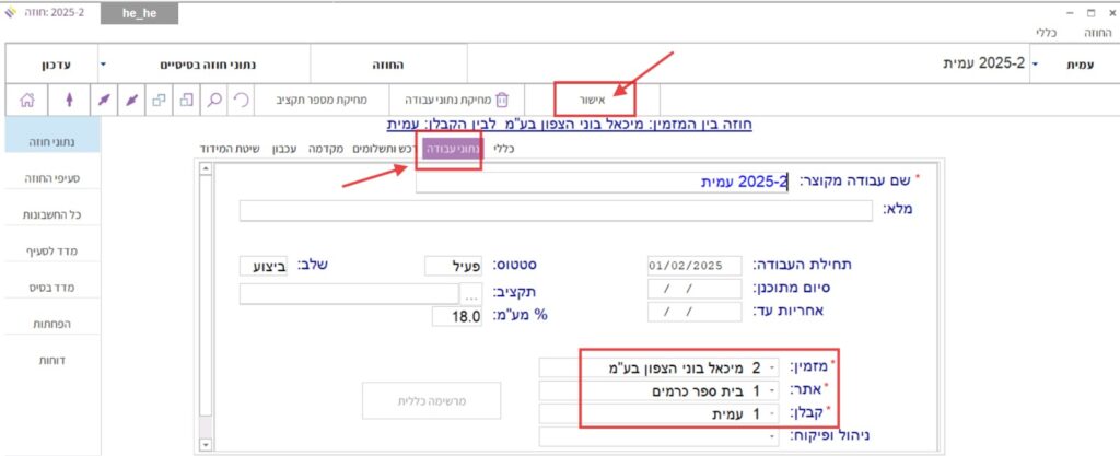 לעבור אל הלשונית “נתוני עבודה”, ולהזין בשדות “מזמין”, “אתר” ו”קבלן” את הפרטים הרלוונטיים לפרויקט. לסיום להקיש על כפתור “אישור” בסרגל שמעל: