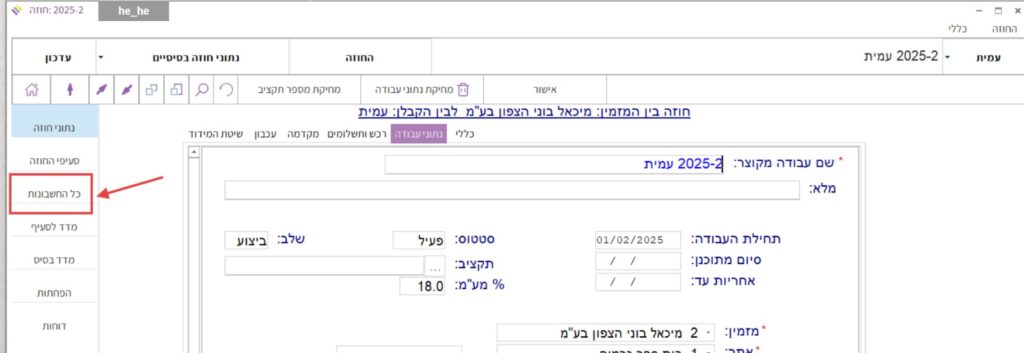 לאחר השלמת נתוני העבודה בשדות “מזמין”, “אתר” ו”קבלן” יש לחזור אל מסך החשבונות באמצעות לחיצה בסרגל השמאלי על הכפתור “כל החשבונות”: