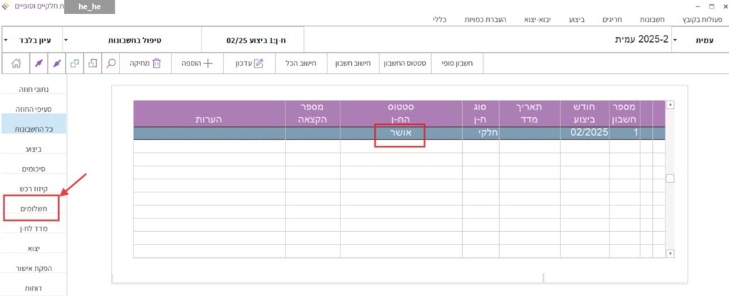 2. לאחר החזרה אל מסך החשבונות כאשר סטטוס החשבון “אושר”, ללחוץ בסרגל השמאלי על הכפתור “תשלומים”: