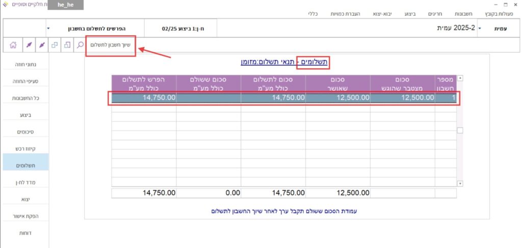 7. לאחר הלחיצה על “אישור עדכון” נראה מתחת לשורת התשלום את שורת החשבון ששויך לתשלום. שימו לב שסטטוס החשבון הפך אוטומטית ל”שולם” (בהנחה שסכום התשלום מכסה את החשבון במלואו):