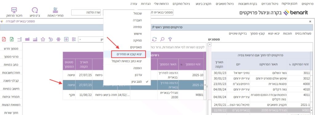 1. במסך “מסמכי בנארית לעבודה”, ללחוץ לחיצה ימנית בעכבר על הקובץ שרוצים לייצא > ולבחור בפקודה “יצוא קובץ או מחירים”: