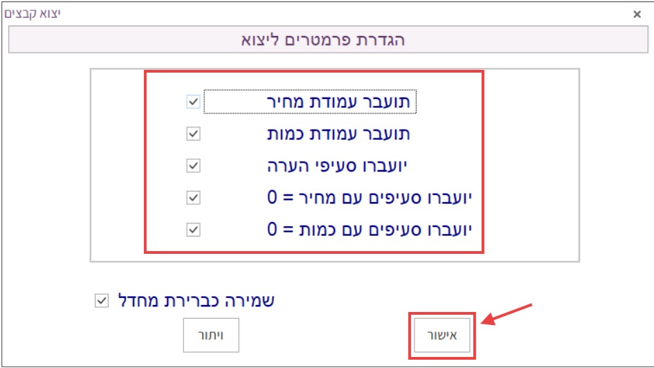 לאחר הגדרת הפרמטרים הרצויים לייצוא, יש ללחוץ על “אישור”: