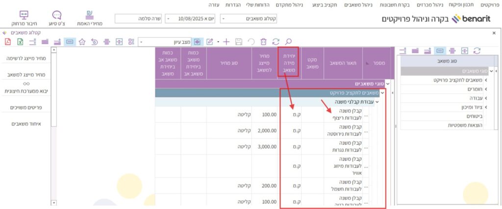 בקטלוג המשאבים, להוסיף את המשאבים של קבלני המשנה תחת סוג המשאב הרלוונטי, ולוודא שביחידת המידה של המשאב בוחרים “ק.מ.” (קבלן משנה):